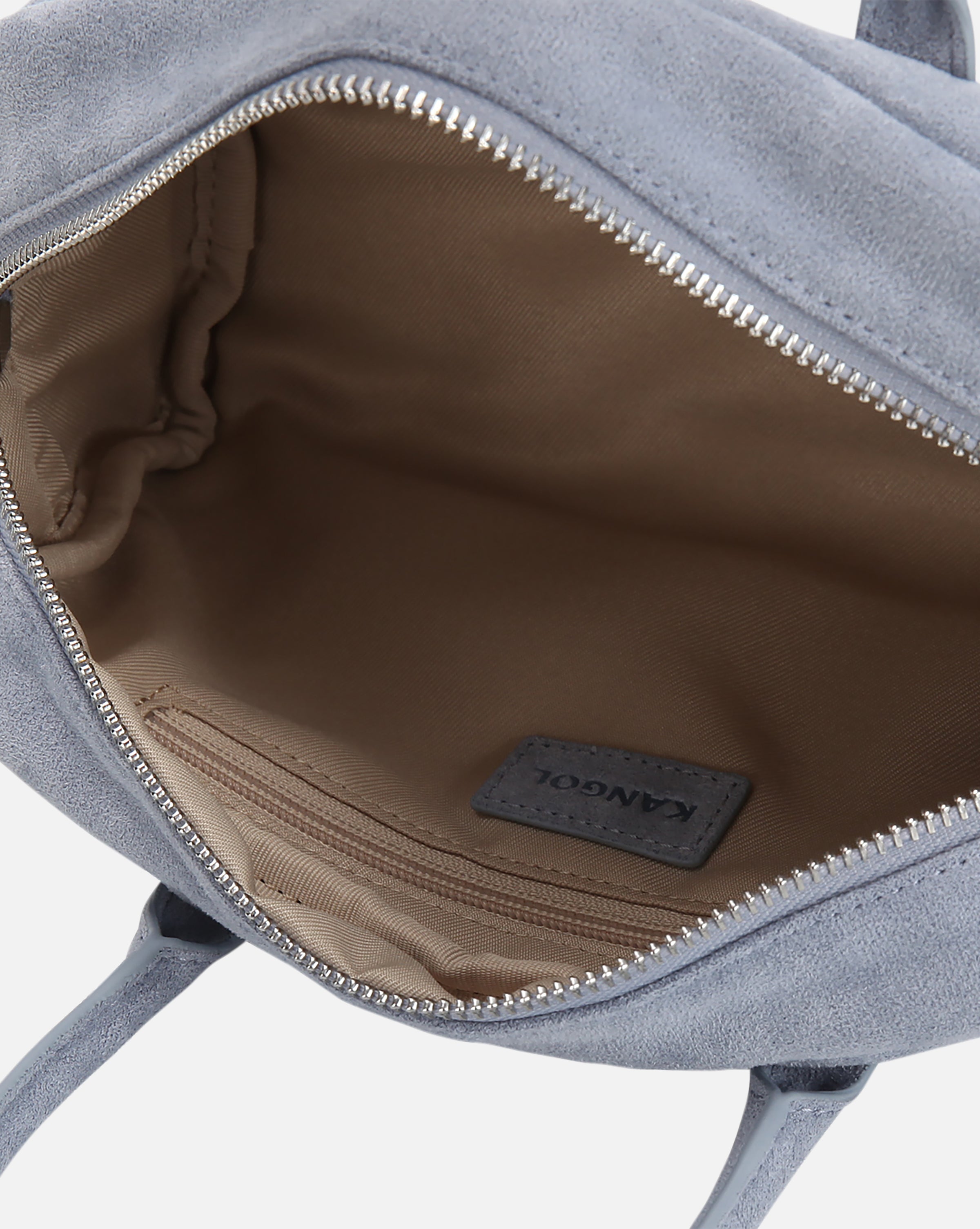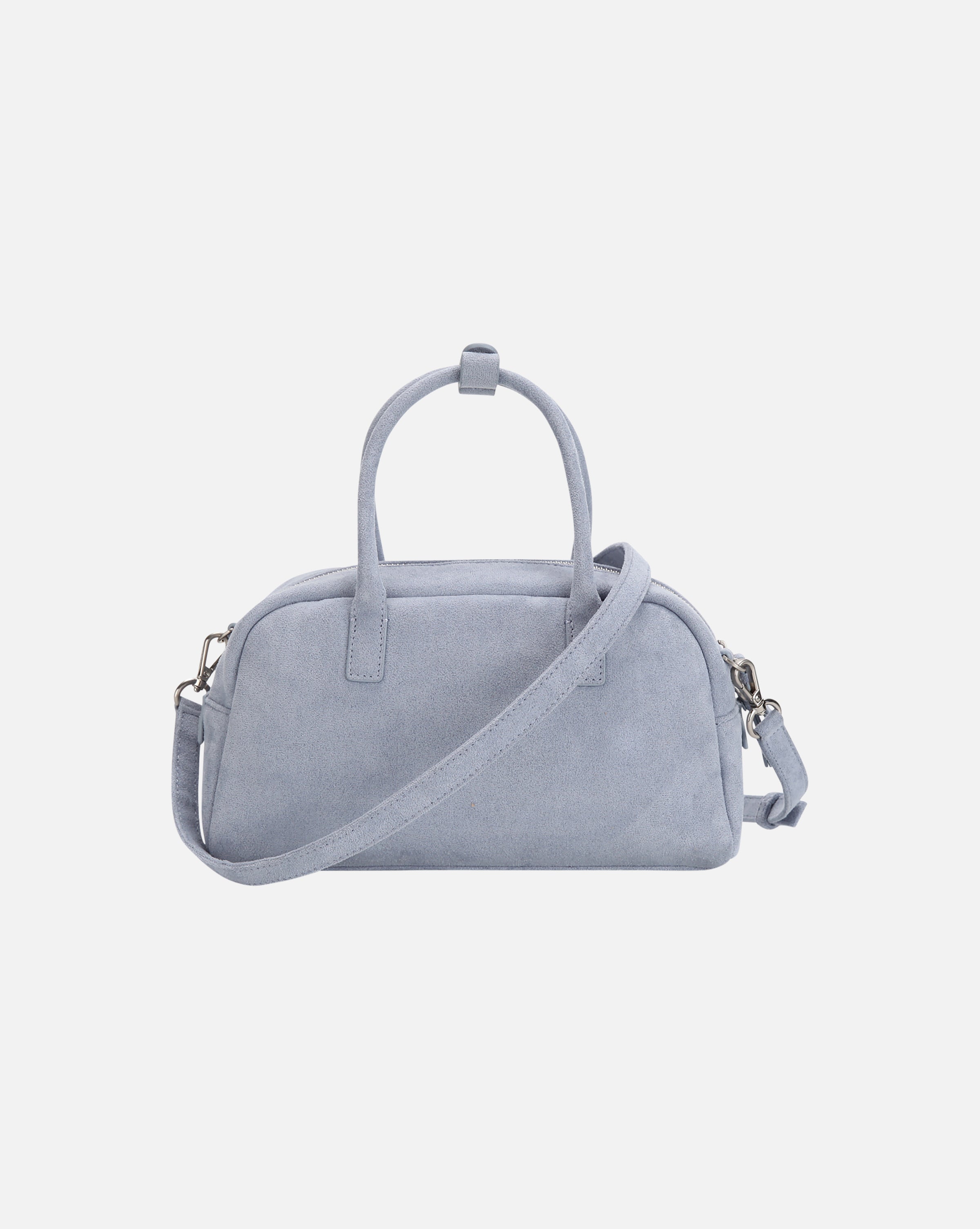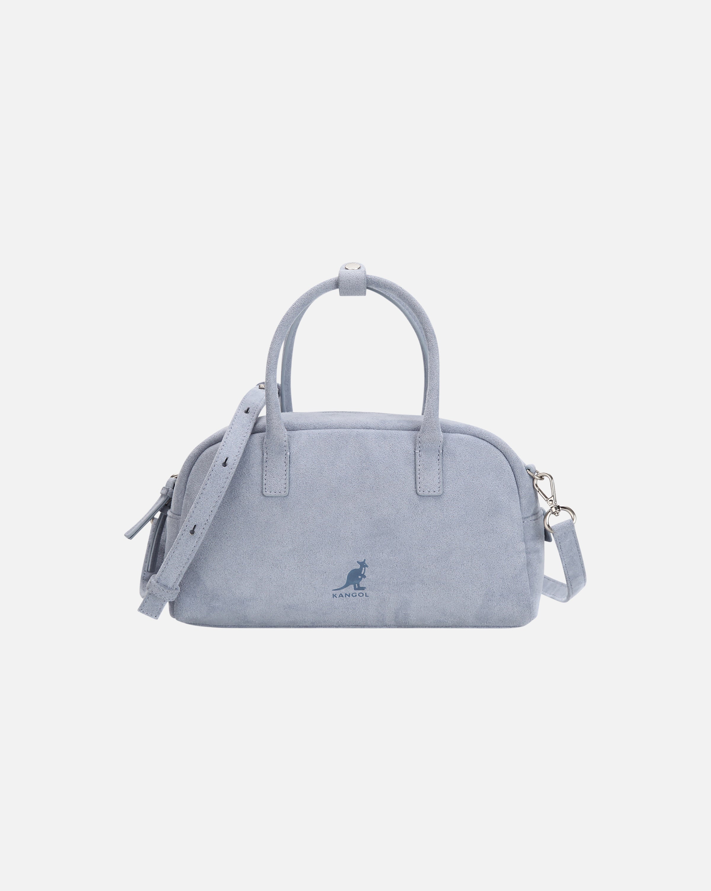 This tote bag is made from a suede-textured fabric with a soft, plush feel. Features an embossed logo on the front and top handle with snap-button closure. Also includes a detachable strap with button stud detailing for easy, multi-style wear.