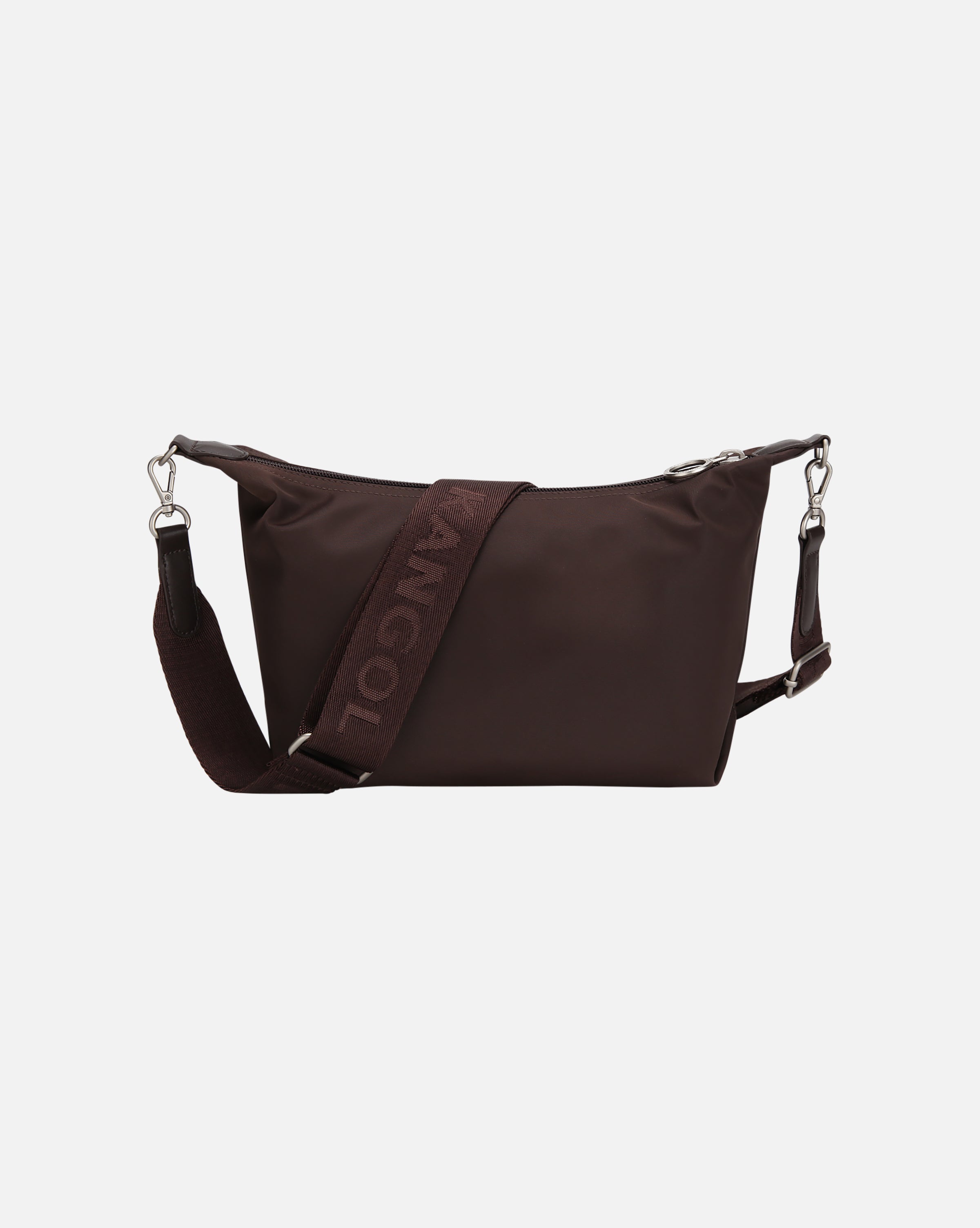 Mini hobo bag crafted from nylon fabric with a subtle shine - Accented with a sleek metal logo. Features an adjustable top handle and a detachable webbing strap for 2-way styling. Also includes an inner zip pocket for storage.