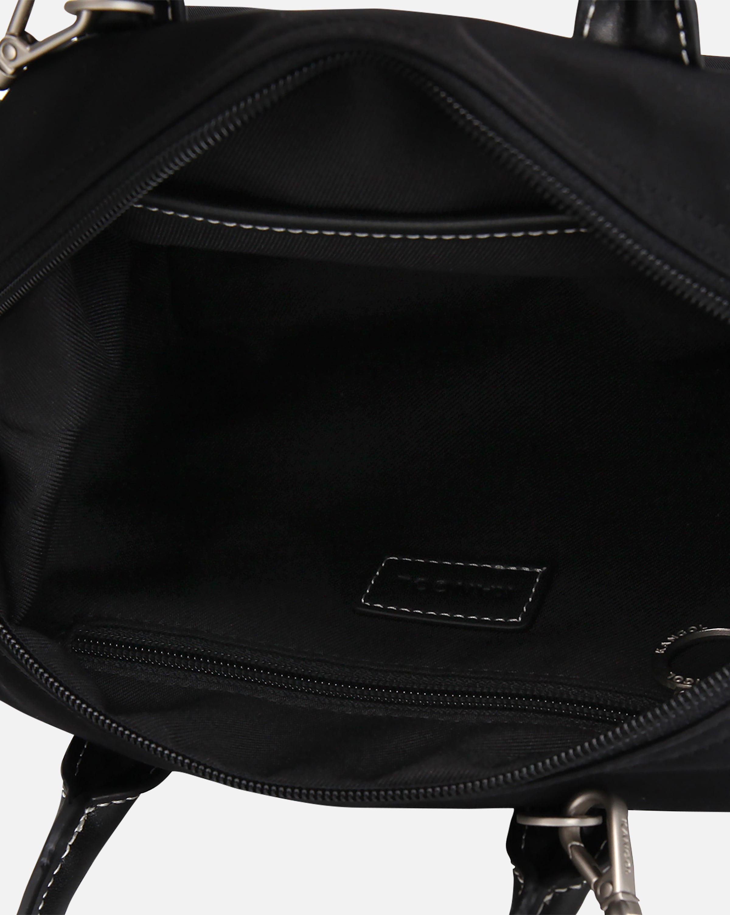 Mini tote bag crafted from nylon fabric with a subtle shine. Front print featuring the signature kangaroo symbol, accented with contrast-color stitching. Includes detachable and adjustable strap that allows for versatile 2-way styling - also features an inner zip pocket for storage.