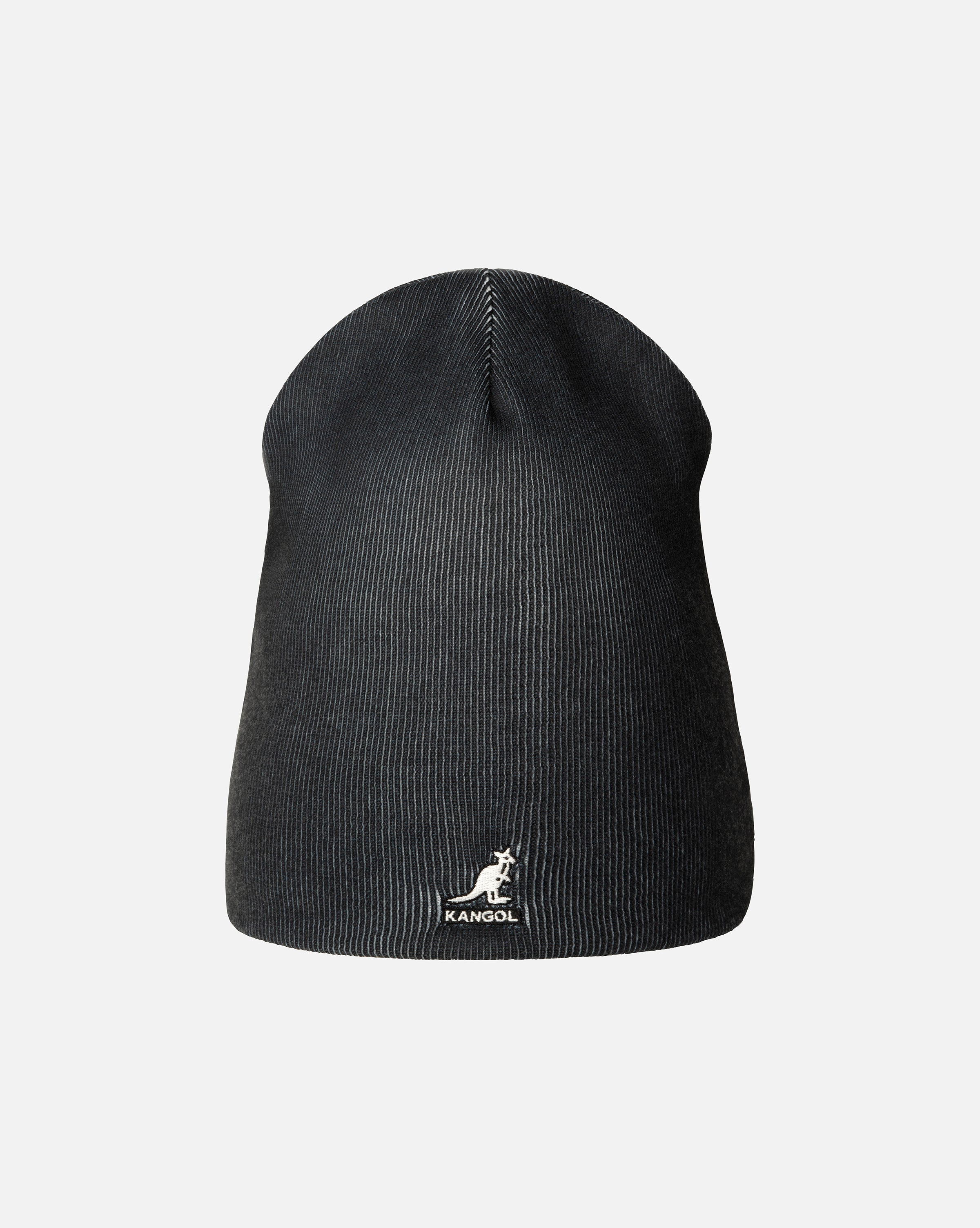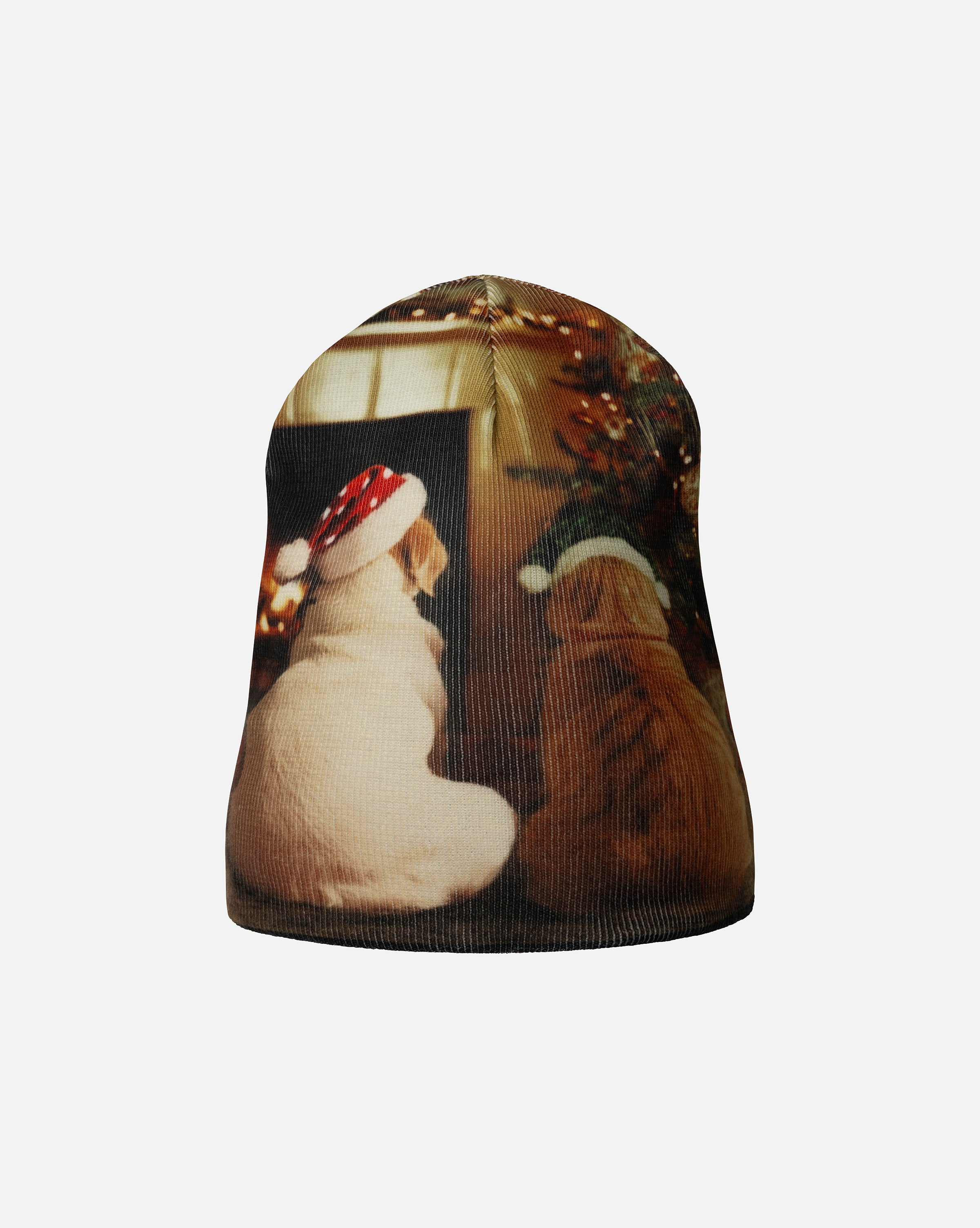 The Holiday Reversible Buddy Beanie is a soft rib knit slouchy pull on that is two looks in one. One side is solid black with our Kangol™ Kangaroo logo embroidery at the center front, while the other side features an AI-generated holiday scene with our 2 animal friends, Kan and Gol.