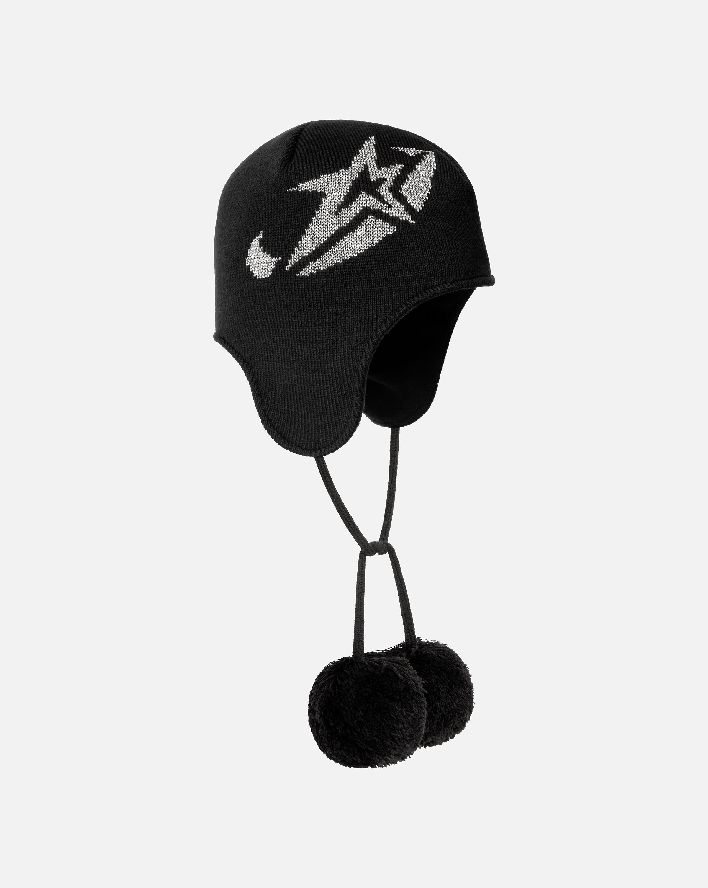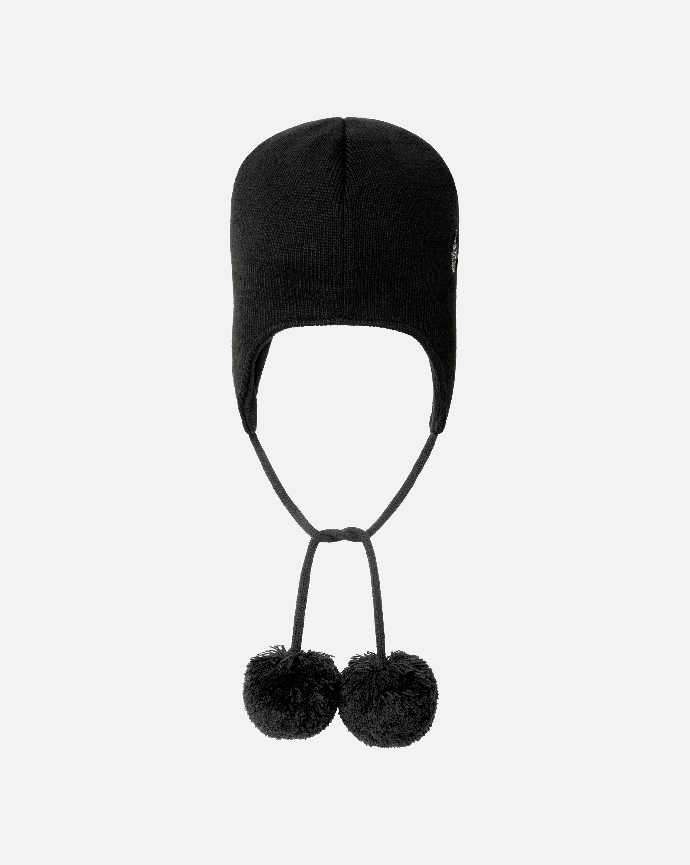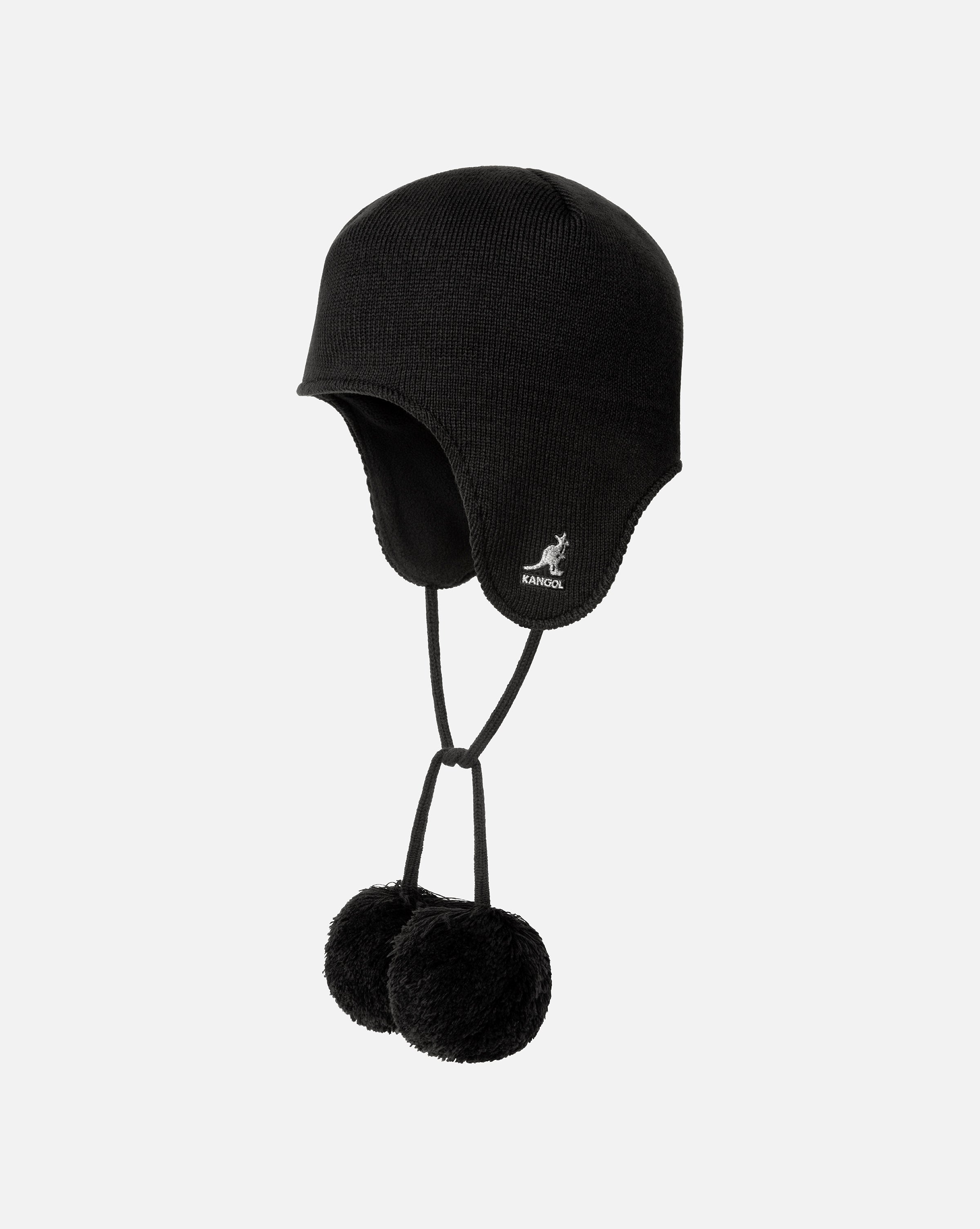 The Holiday Star Bonnet is a cozy acrylic knit style with a polar fleece lining. The right side of the crown features a Y2K-inspired holiday star in a metallic yarn, while the functional chin cords are trimmed with plush pom-poms. This style is complete with our Kangol™ Kangaroo logo embroidery at the left side earflap.