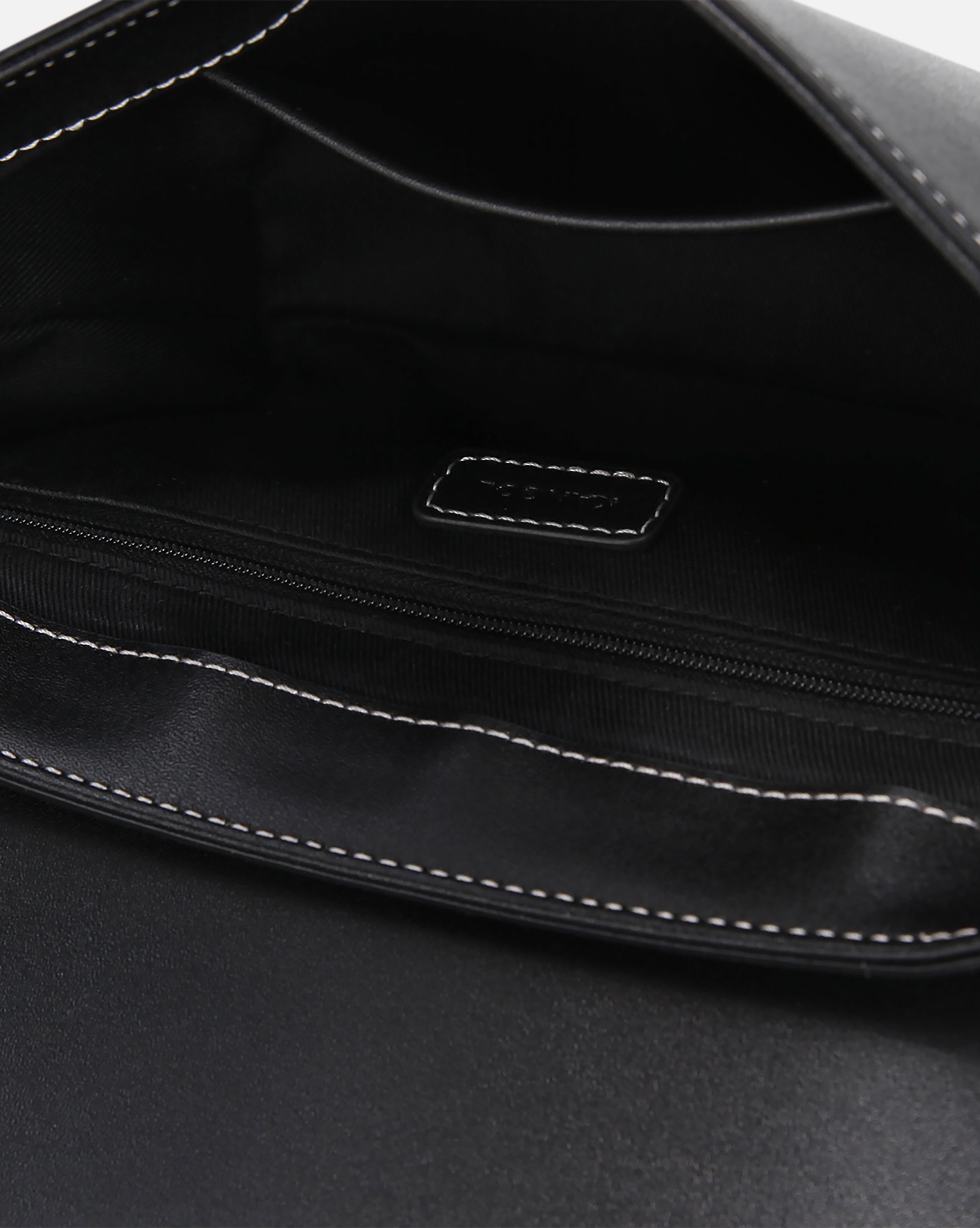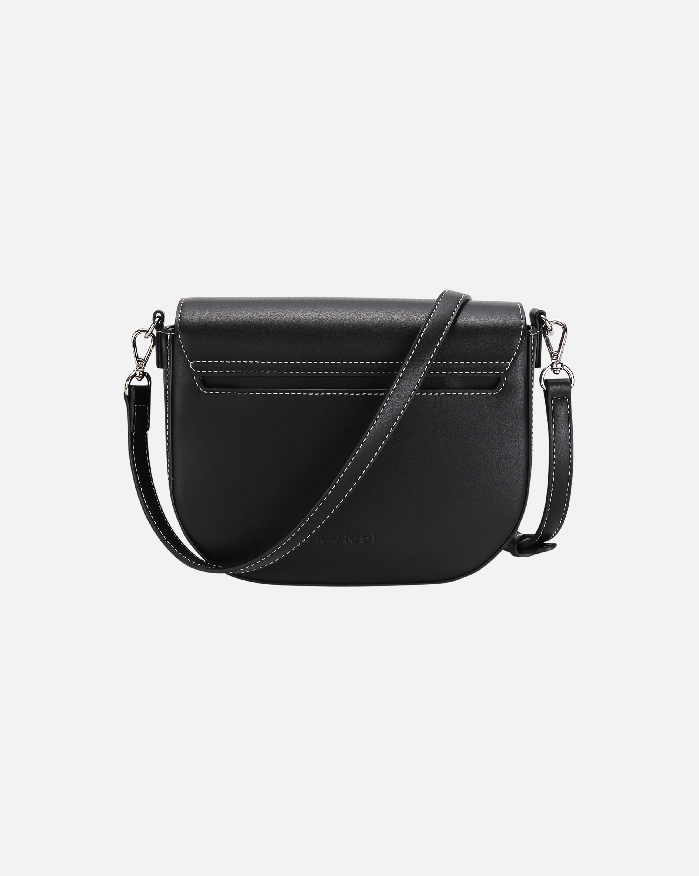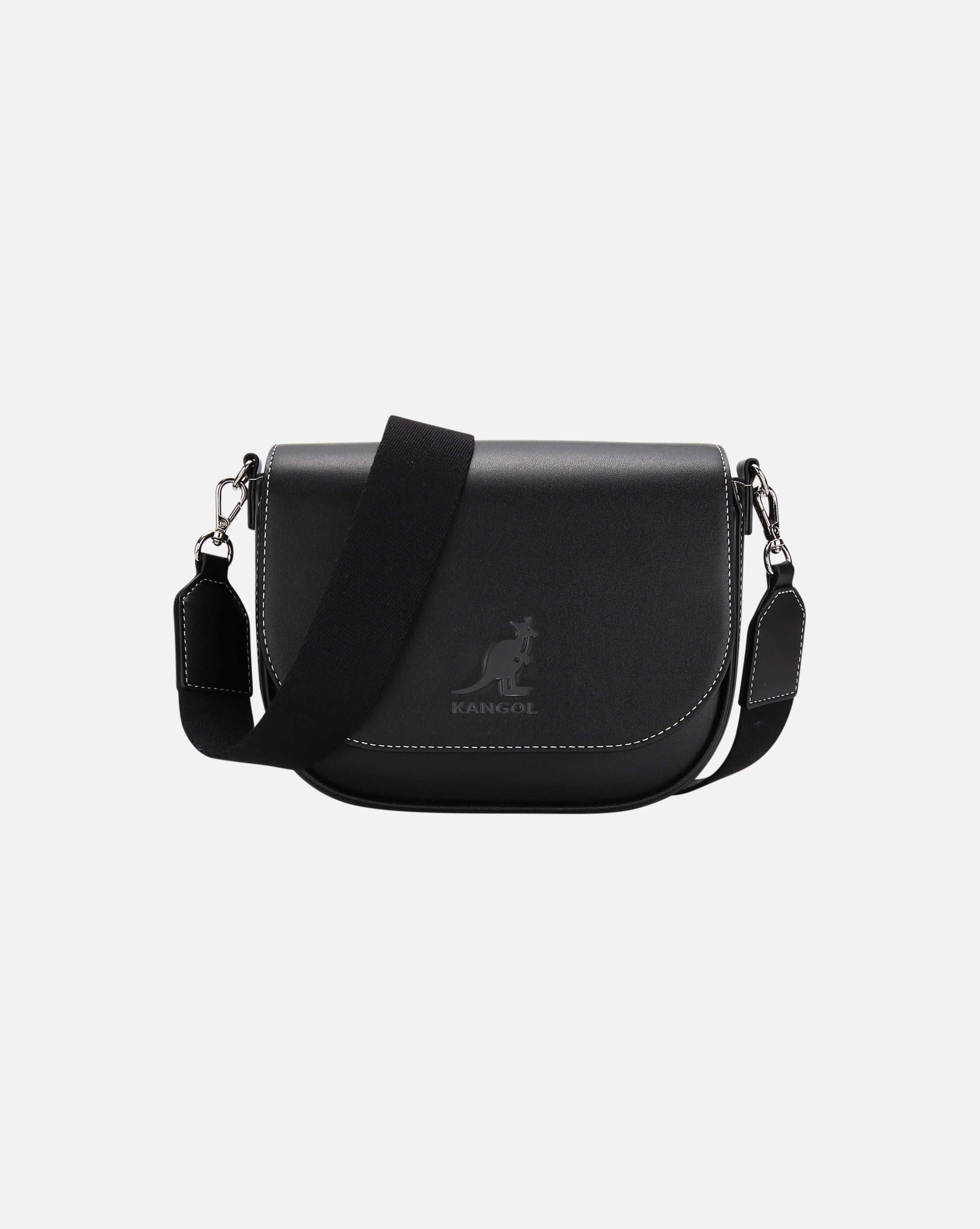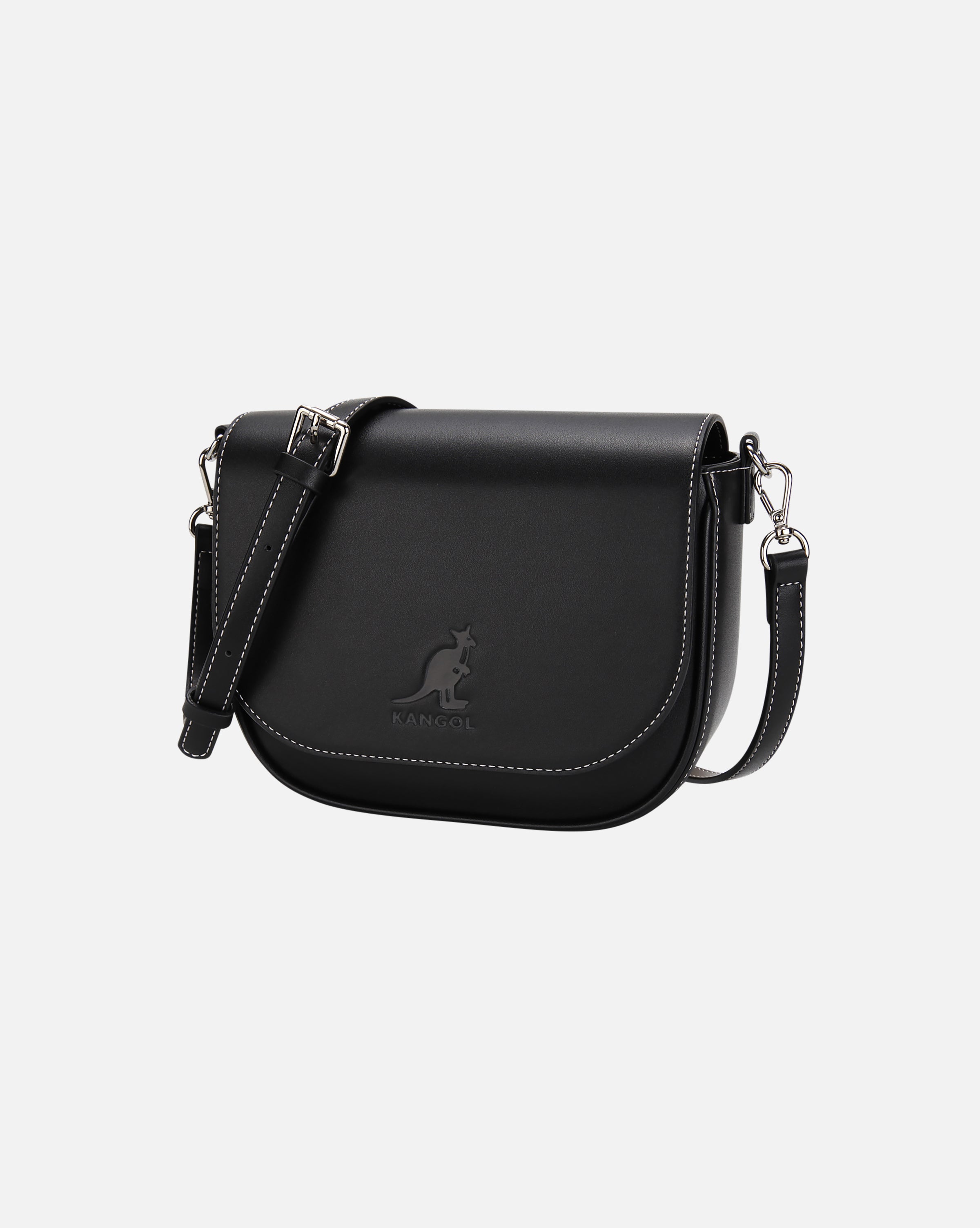 Square-shaped saddle-style crossbody bag. Offers 2-way styling with two detachable straps; a classic PU long strap and a casual webbing strap. Tonal embossed logo and contrast-color stitching throughout. Multiple inner and outer compartments for organized storage.