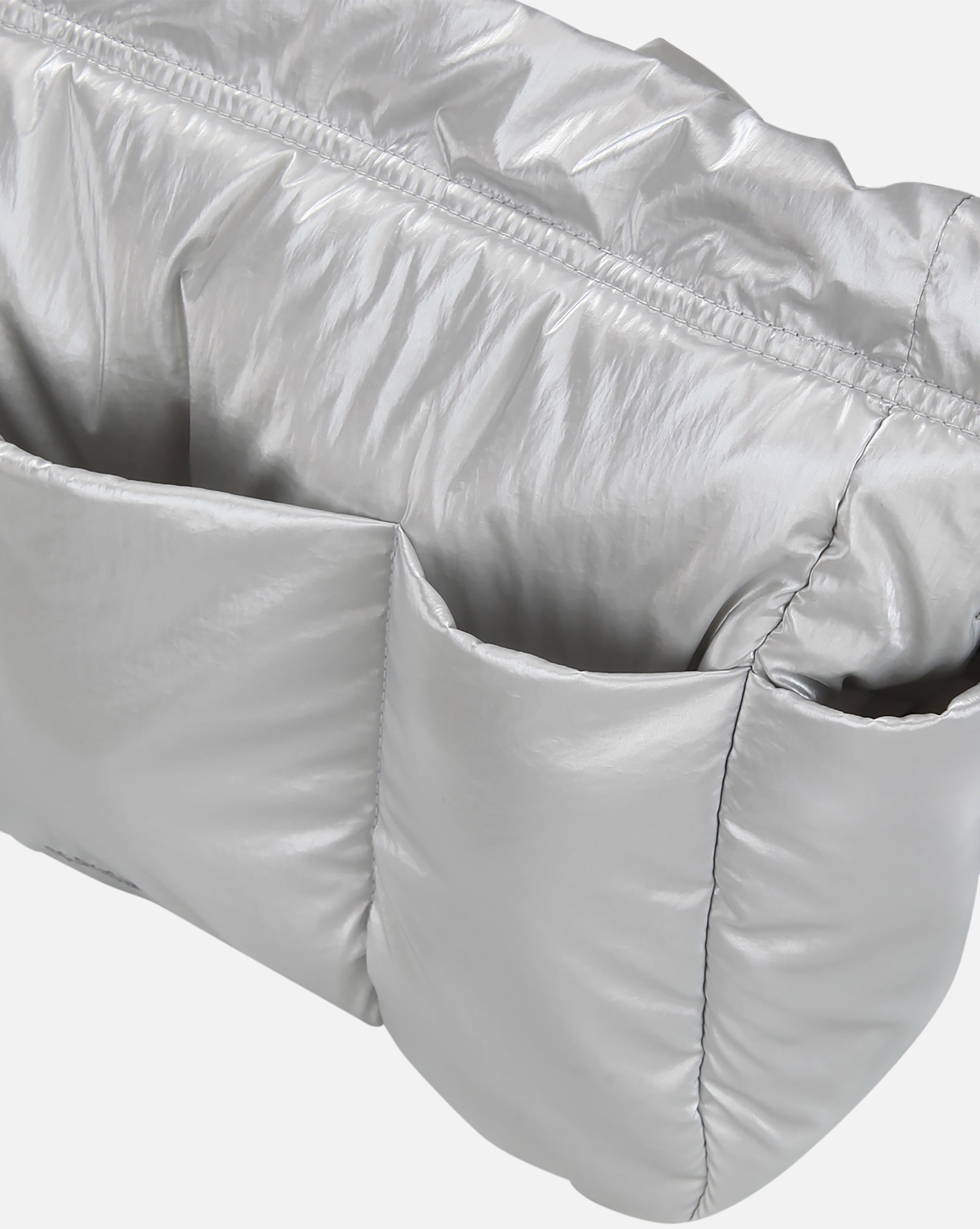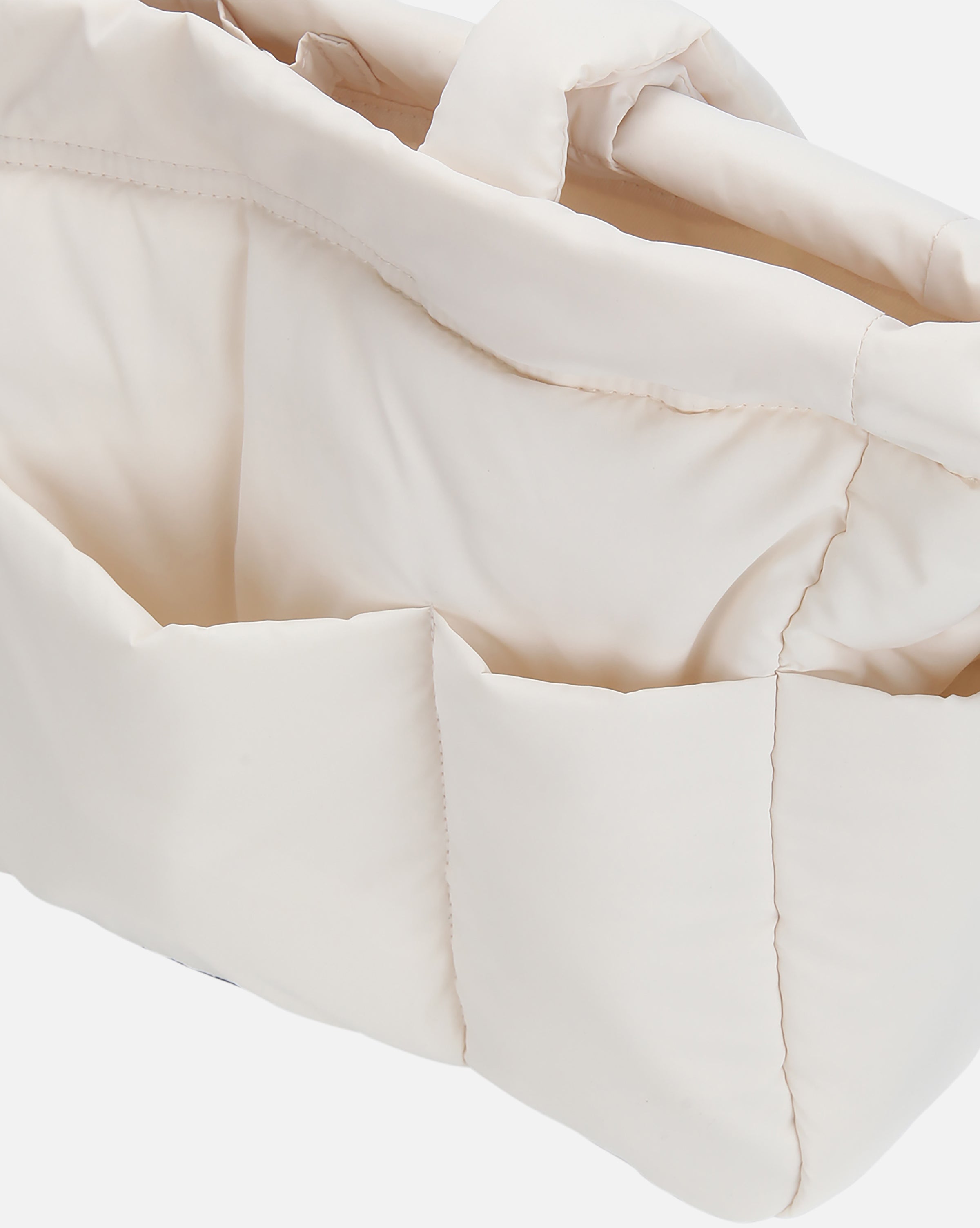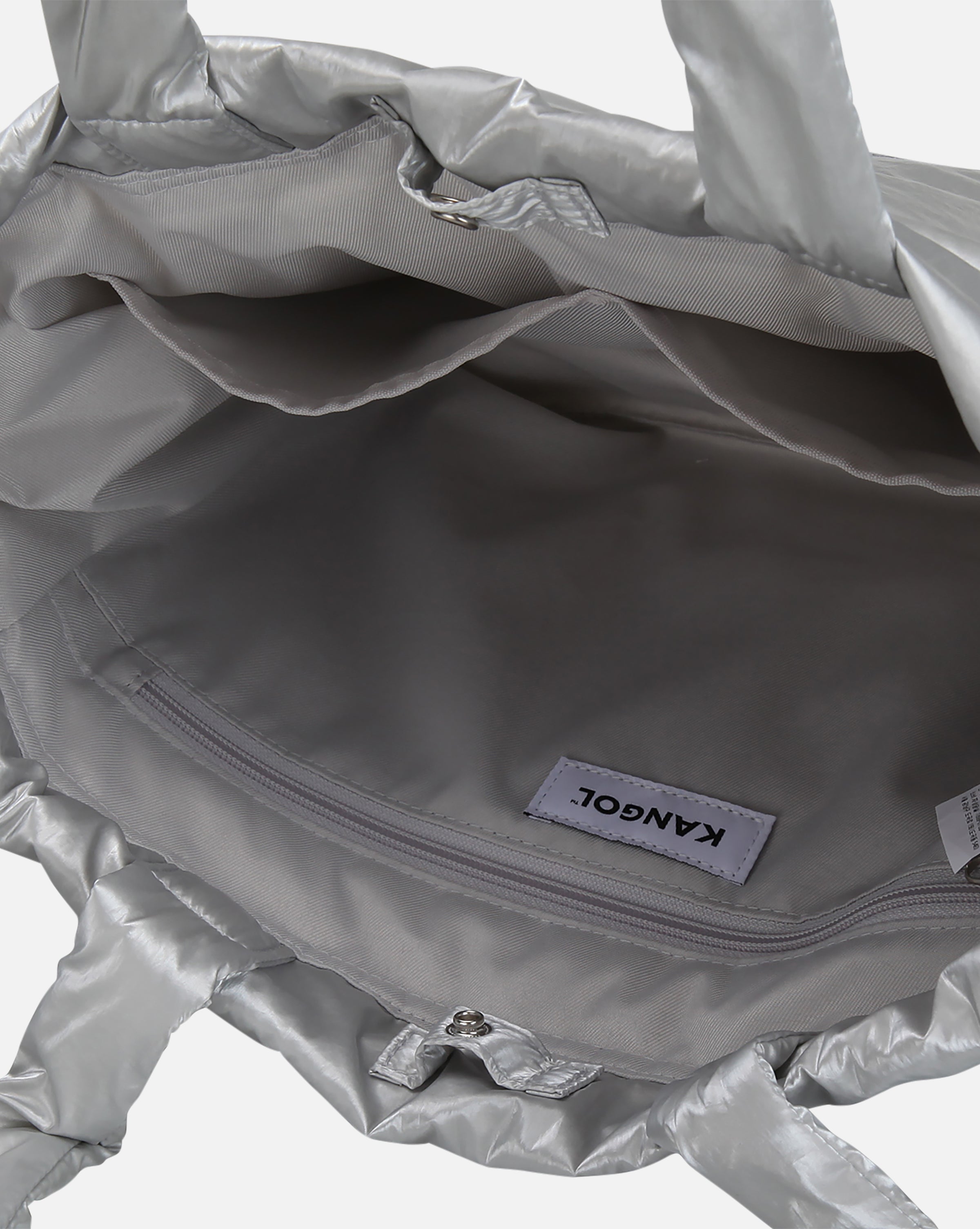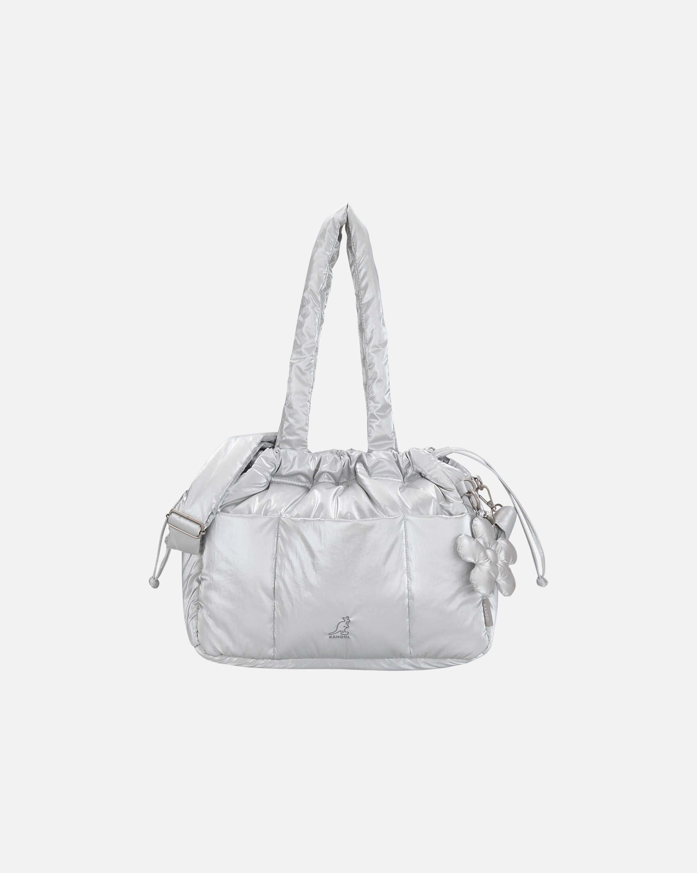 This large-sized tote bag is made from soft puffer fabric and features signature Kangol logo embroidery on the front. Adjustable drawstrings on both sides allow for two different silhouette options. Multiple outer pockets provide easy access and convenient storage. Also comes with a detachable puffer long strap for versatile 2-way styling and a detachable puffer flower-shaped charm set.